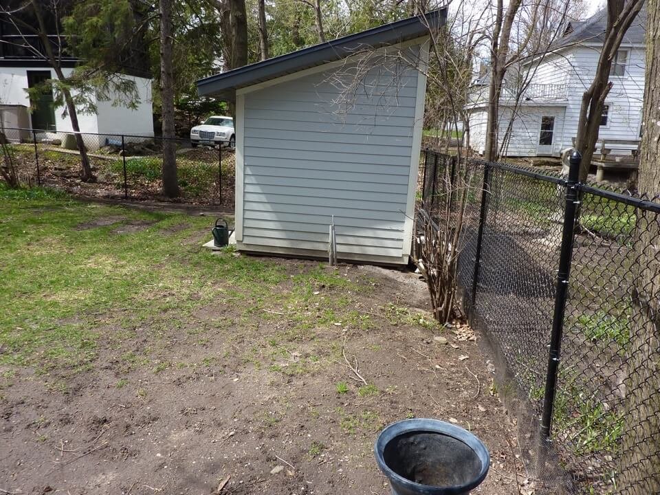 We started the construction project late fall where we did the concrete forms and footings for the structures and also started on the multi-level patios. One of the biggest problems encountered would definitely be the swimming pool. This pool was added after most of the construction was done and not a lot of space was left. We only had one corner left to insert the pool. A steep slope was in that same corner which we cut back by adding an armour stone wall. We pushed the shed as close as possible to the retaining wall and were left with an area big enough to receive an 8’x14’ pool at the biggest. It’s not very big but it works!