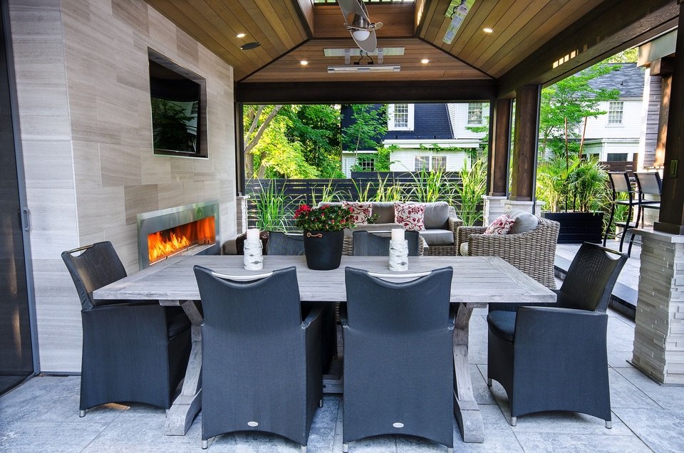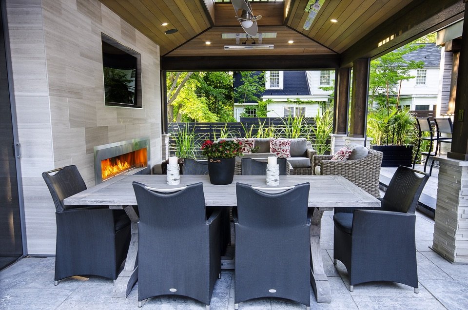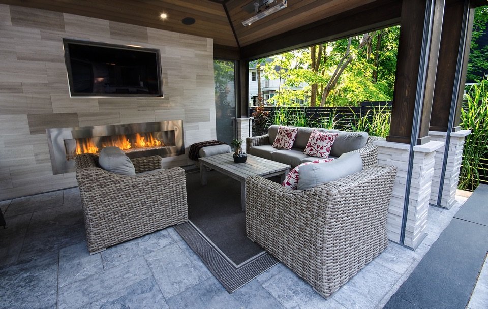 • 18’x24′ pavilion with closed back wall for a fireplace and television, it also has infrared heaters to be able to enjoy the structure in the colder weather, a sound system and automated screens.